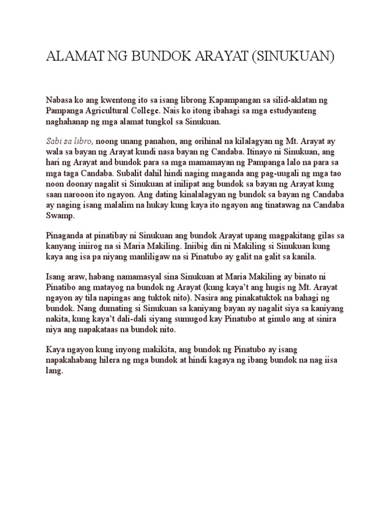 Itinayo ni Sinukuan ang hari ng Arayat and bundok para sa mga mamamayan ng Pampanga lalo na para sa mga taga Candaba. Zanaguilar7777777 zanaguilar7777777 Ang Alamat ng Bundok Arayat Sinukuan New questions in Filipino. Subalit ang engkantada ay hindi mo raw makikilala dahilan sa ibat ibang.