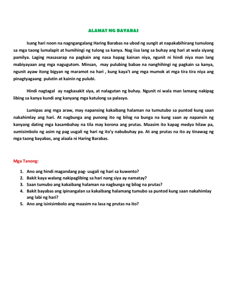 16092019 Ano ang buod ng alamat ng bayabas. Maraming tahanan ang naktayo sa paanan ng bundok. Si Haring Barabas ay kinatatakutan ng kanyang mga sinasakupan ngunit palihim din nila itong kinamumuhian.