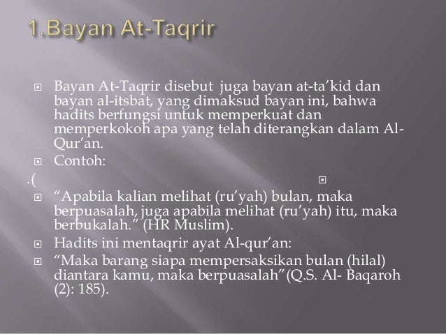 Bayan At-Taqrir disebut juga dengan bayan al-taqid dan bayan al-isbat yaitu memperkuat dan memperkokoh pernyataan Al-Quran. Bayan Takid Bayan takid atau disebut juga dengan bayan Taqrir atau bayan itsbat adalah hadist yang berfungsi untuk memperkokoh atau memperkuat isi kandungan Al-Quran2 Dalam hal ini hadist hanya berfungsi untuk memperkokoh isi kandungan Al-Quran3 dengan. Fungsi hadits dalam hal ini adalah memberikan perician dan penafsiran dari suatu permasalahan dalam ayat Al-Quran seperti tentang shalat puasa zakat haji.
