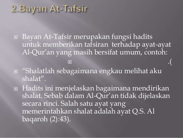 فمن شهد منكم الشهر فليصمه maka barang siapa diantara kamu melihat bulan maka hendaklah berpuasa QS. Hadis yang berfungsi sebagai bayan. 2015-09-27 Sedangkan imam Syafii menyebutkan ada lima fungsi yaitu.
