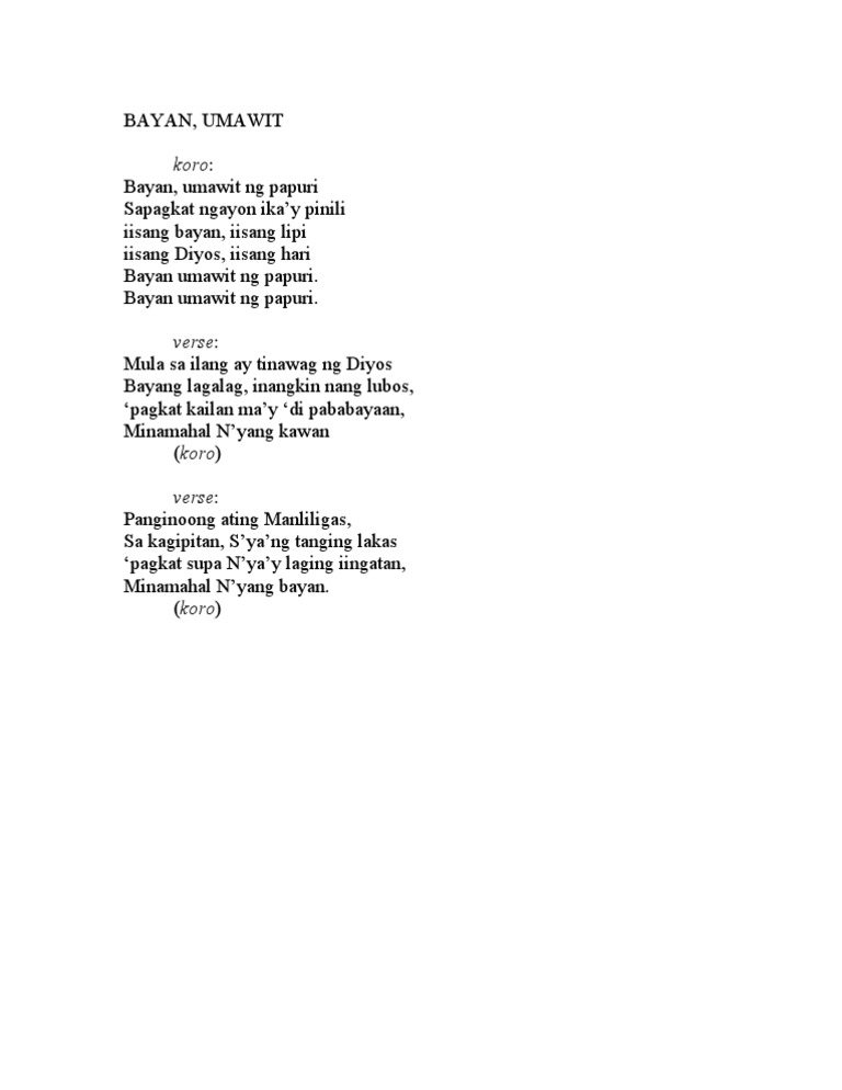 Get this from a library. Bayan umawit ng papurisapagkat ngayon ika pinili iisang bayan iisang lipi iisang Diyos iisang hari Bayan umawit ng papuri Bayan umawit ng papuri. Bayang lagalag inangkin nang lubos pagkat kailanman y di pababayaan minamahal Nyang.