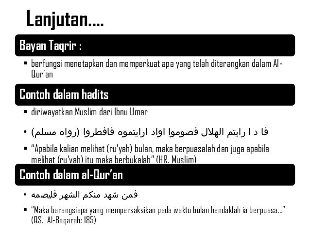 Sebagaimana contohnya hadist. Bayan Al-taqrir disebut juga dengan bayan Al-takid dan bayan Al-itsbat. 2016-12-12 Dengan Imam Ahmad bin Hanbal menyebutkan empat fungsi yaitu.