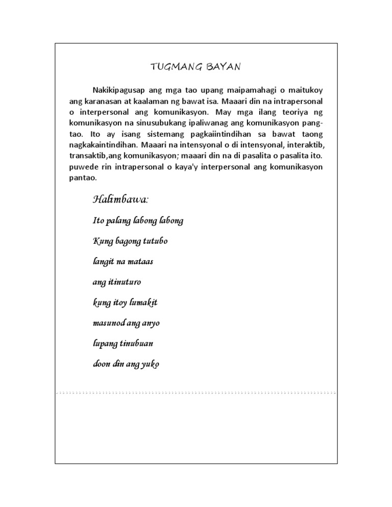 Tugmang bayan panitikan. 2016-07-17 Panahon ng Katutubo Bago pa man dumating ang mga Kastila sa Pilipinas mayroon nang sining at panitikan ang mga sinaunang PilipinoKaramihan sa mga panitikan nilay yaong mga pasalin-dila gaya ng mga bulong tugmang-bayan bugtong epiko salawikain at awiting-bayan na anyong patula. Mga kwentong bayan alamat at mito na anyong tuluyan at ang mga katutubong. 2016-08-18 Kahit ang mga sinaunang Pilipino ay nakatuklas ng ibat ibang mga panitikan na nagbungsod at nagbigay karagdagan ng kaalaman sa kapwa tao na umaabot rin sa ibang lugar kagaya ng yaong mga pasalin-dilagaya ng mga bulong tugmang-bayan bugtong epiko salawikain at awiting-bayan na anyong patula mga kwentong-bayan alamat at mito na anyong tuluyan at.